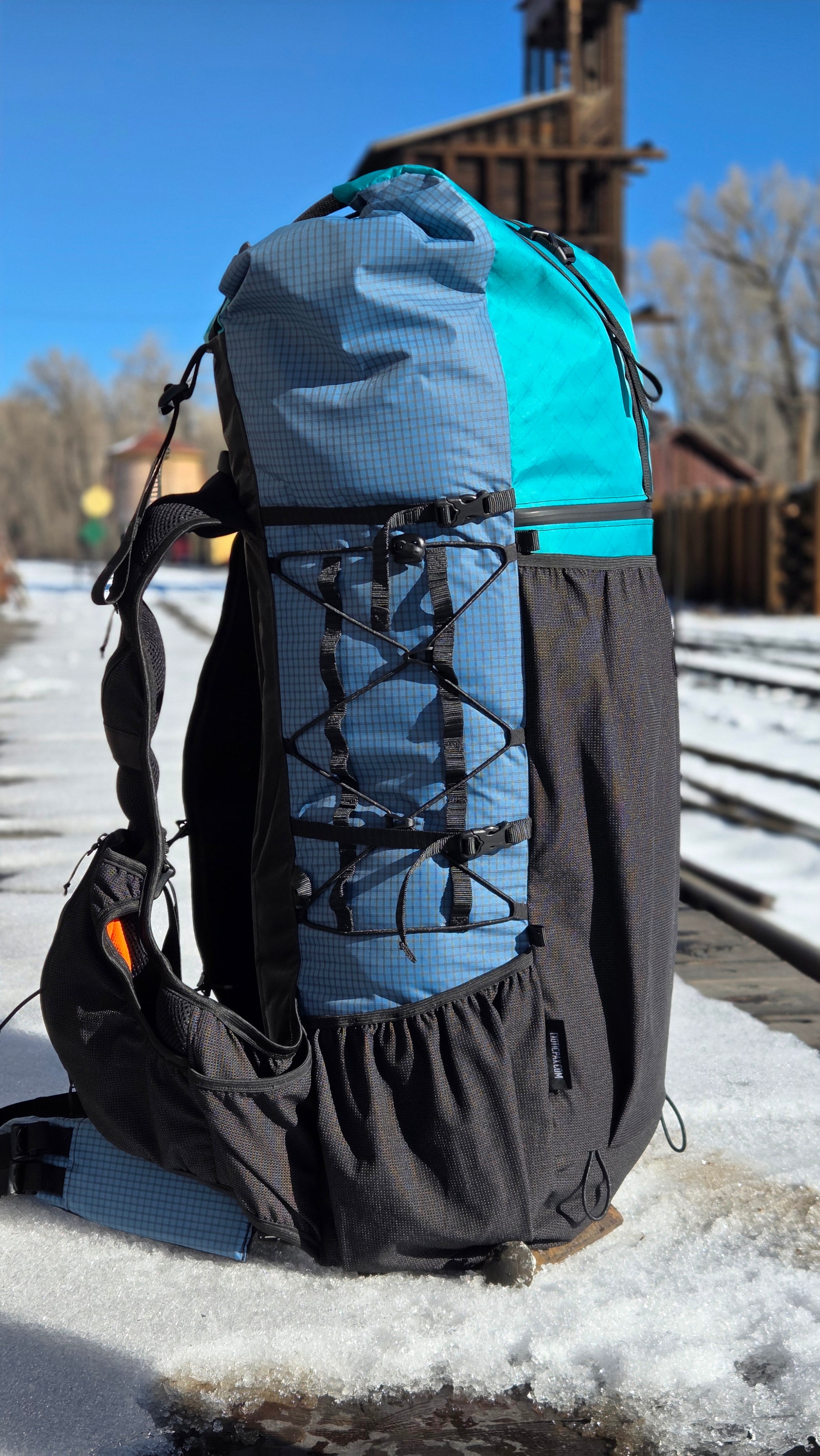 3/8" daisy chain webbing (double channel) along opposite side panel for lashing + zig-zagged shock chord compression over top.